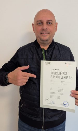 „Dieses Zertifikat ist wichtig für den Weg in die Zukunft“ sagt Addi nach erfolgreich bestandener B2-Prüfung. Er  gehört zu der wachsenden Zahl der Kursteilnehmer von Angekommen, die dieses höhere Sprachlevel erreichen. Für die meisten qualifizierten Berufe sind deutsche Sprachkenntnisse auf B2-Niveau unbedingte Voraussetzung.
